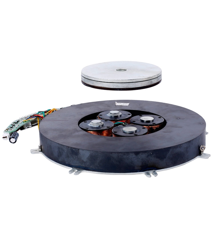 På billedet her ser du det tekniske modul der sidder inde i pladen, samt magneten der sidder inde i potten som svæver over pladen.